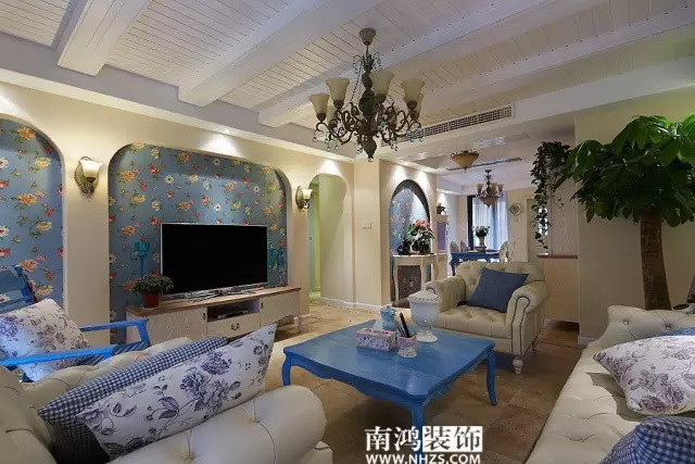 地中海風格中的茶幾,和木紋飾面的沙發相映成趣,中空處擺上盆栽,仿佛成了一個小展館。