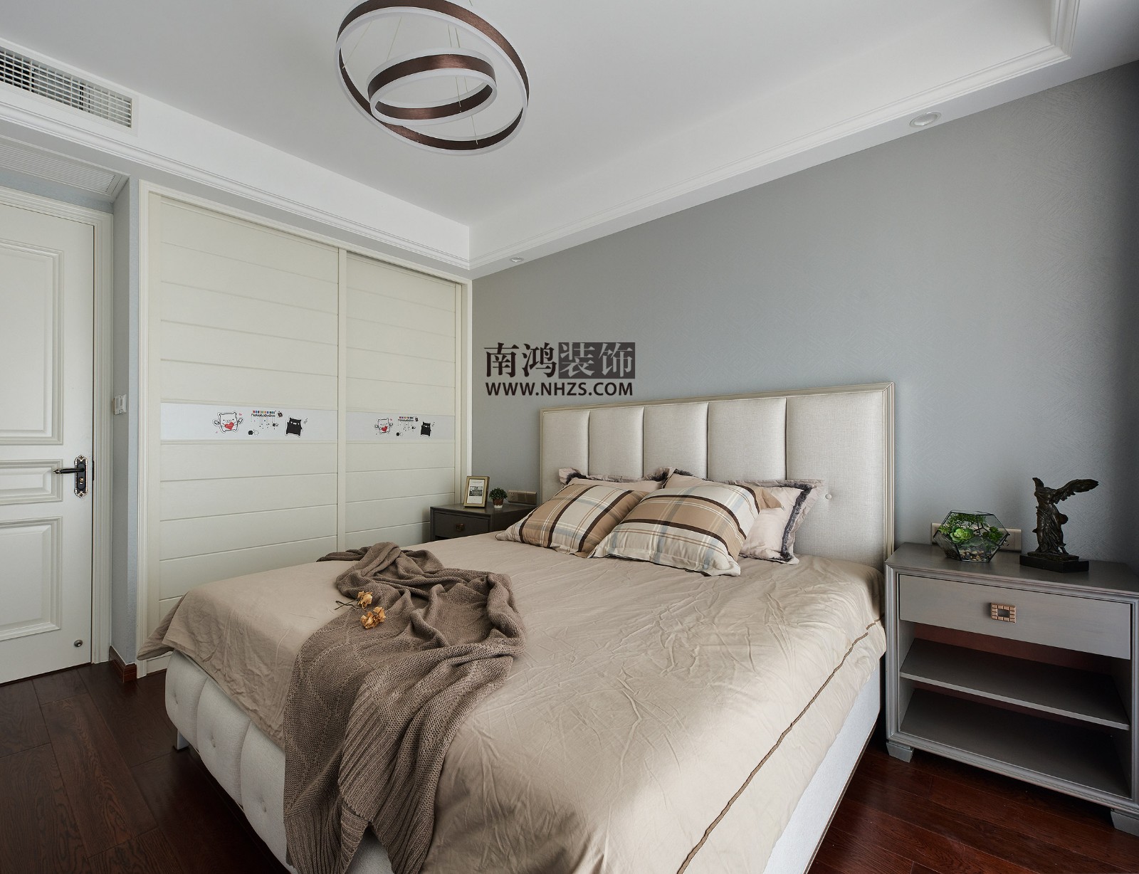 次臥是一個低調沉穩的灰色空間,無論是頂部的藝術吊燈,還是深灰色的床頭柜,造型都非常簡約。落地窗為室內導入通透光線,顯得清爽而透亮。