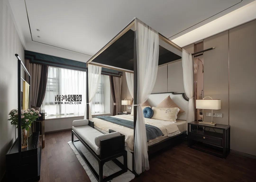 主臥背景墻選用淺色的硬包內嵌金屬條,軟裝上則應業主的需求,布置得相當古色古香,唯美的東方韻味,置身其中,讓人只想隔絕一切喧囂,回歸最真實的恬淡心境。