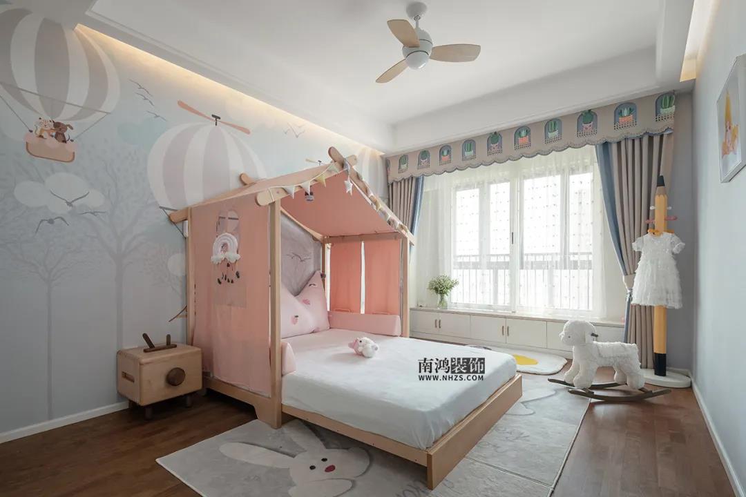兒童房一。給小公主布置的房間,無論是粉色樹屋小床,還是鉛筆狀的掛衣桿,亦或是窗簾、背景墻、床頭柜、地毯,都是童趣滿滿的選擇,想必一定能成為孩子最愛的休憩場所。