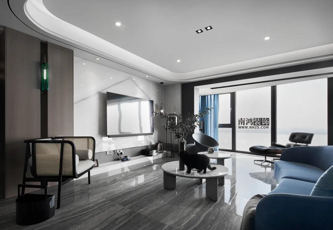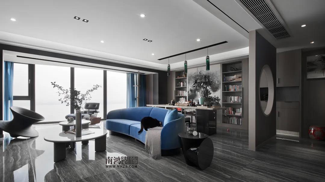地址 / 觀瀾時代 戶型 / 三室兩廳 面積 / 190㎡ 風格 / 現代中式 設計施工 / 浙江南鴻裝飾 幸福的家庭總是相似的, 但幸福的定義, 對每個人來說或許都不盡相同。 對本案的女屋主來說, 窗外是海天一線的絕色風景, 窗內是三只愛貓的追逐嬉戲, 閑來品茶凝思,翻卷細讀, 就這樣把日子過成了一首詩。 本案結合現代風的輕奢時尚與中式風的古典雅致,色彩搭配上也不落俗套,整體取用冷硬中性色的基礎上,各個空間都加入了許多個性色彩,層次感非常強! 戶 型 圖 ▲原始戶型圖 ▲平面設計圖 設計說明: ①餐廚之間新建墻體,增加儲藏室的空間; ②客廳包進陽臺做落地窗,將房子的景觀優勢發揮到最大; ③公區域通往臥室的內廳過道整體往南移,主臥釋放一部分面積留給客房,平衡主客房的空間大小。 玄 關 Entrance 原戶型中并沒有玄關區域,我們在茶室旁砌筑了這道168cm*235cm的墻體,以中式常見的借景手法打造門廳,并將茶室區的柜子延伸過來作玄關柜使用。 客 廳 Living Room 一氣連江色,寥寥萬古清。客廳將陽臺包進做落地窗,再加一把面料舒適的躺椅,每日觀覽著江波浩渺,俗世的煩擾轉瞬就能被驅散得干干凈凈。 湖水藍的弧形沙發,橡木大理石結合的茶幾,黑色烤漆角幾,陀螺椅......客廳內各色材質多樣、姿態各異的家具被有序排列著,再加上綠植點綴,空間在干練精致之余,更顯出生機勃勃的氣息來。 沙發背后便是因女主人愛好而特意設置的休閑茶室區了,背景的藝術壁畫烘托雅致氛圍,兩側書柜用來收納主人心愛的藏書,靠近陽臺的地方還做了貓爬架,喵主子們當然也不能怠慢啦~ 餐 廳 Dining Room 餐廳做島臺餐桌一體式設計,實用性和使用感都很好,黑白搭配帶來明凈的視感,自然的石材肌理配合空間情境,更顯素雅沉靜。 廚 房 Kitchen 廚房,淺色模壓櫥柜門帶來輕盈、舒緩的視覺體驗,黑色把手干凈利落,頂部做白色集成吊頂,空間更加明亮。 廚房靠近餐廳的地方延伸出去做了一塊西廚區,吧臺搭配高腳凳,閑時品一杯紅酒,嘗一嘗親手做的糕點,別有一番情趣。 臥 室 Bedroom 芥末黃提供主臥進門的第一視感,帶來鮮活的生命力,也是主人對美好生活的積極期許。 主臥真是滿滿的女王氣質!宮廷色鋪底,背景墻結合浮雕質感的凹凸藝術硬包,個性特質拉滿,窗邊設置獨立浴缸,品質生活更上一層樓。 融合多種材質元素,以現代風格的利落表現結合中式古典的優雅個性,成就別具一格的氛圍感。 黑色鐵藝百葉窗搭配黑白花磚,陽光從間隙里參與進來,空間里點滴都是時光流淌歲月如歌的美好記憶。 床尾的梳妝空間,奶黃色背景搭配梅紅的矮凳和水藍色梳妝臺,飽滿的色彩極具張揚個性。 客房,淺青色背景結合藤編材質,營造清朗舒適的睡眠環境,宛若美好的早春時節。 衛 生 間 Toilet 衛生間墻地面由石紋瓷磚鋪就,深淺不一的灰色打造層次感,整體空間明亮,現代感強烈。